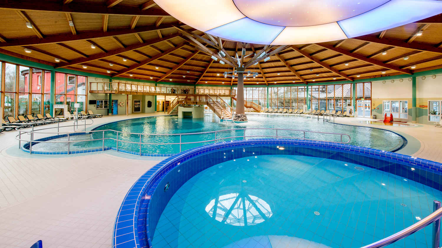 “Urlaub im Alltag” lautet das Motto der Avenida-Therme* am Stausee Hohenfelden. Strömungskanäle, Massagedüsen, Hot-Whirlpools sowie ein kleines Gradierwerk laden zum Entspannen ein. In der Saunawelt und im Wellnessbereich kann man den Alltag hinter sich lassen.