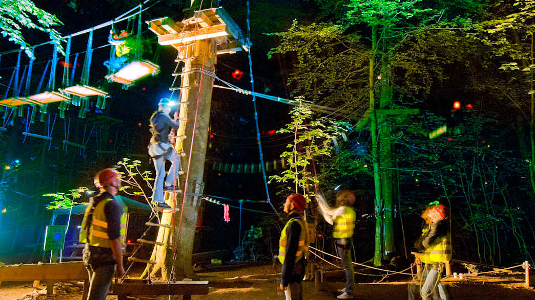 Erlebt die Faszination des Vollmondkletterns. Der Wald ist mit Laternen und Fackeln beleuchtet, die Elemente werden erst direkt vor dem Einstieg erkennbar und die Höhe lässt sich manchmal nur erahnen!
