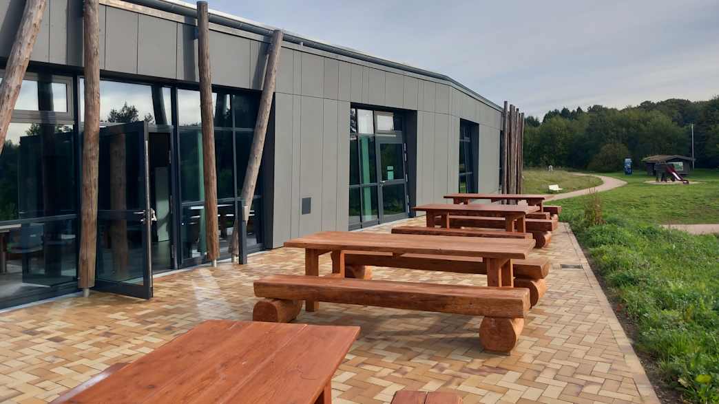 Auf einer großen Grünfläche mit Strohburg, Menschen-Kicker, Torwand, Rollbahn und weiteren Spielgeräten können sich Kinder und Erwachsene nochmal richtig austoben. Überdachte Tische und Bänke stehen zum Picknick bereit.
