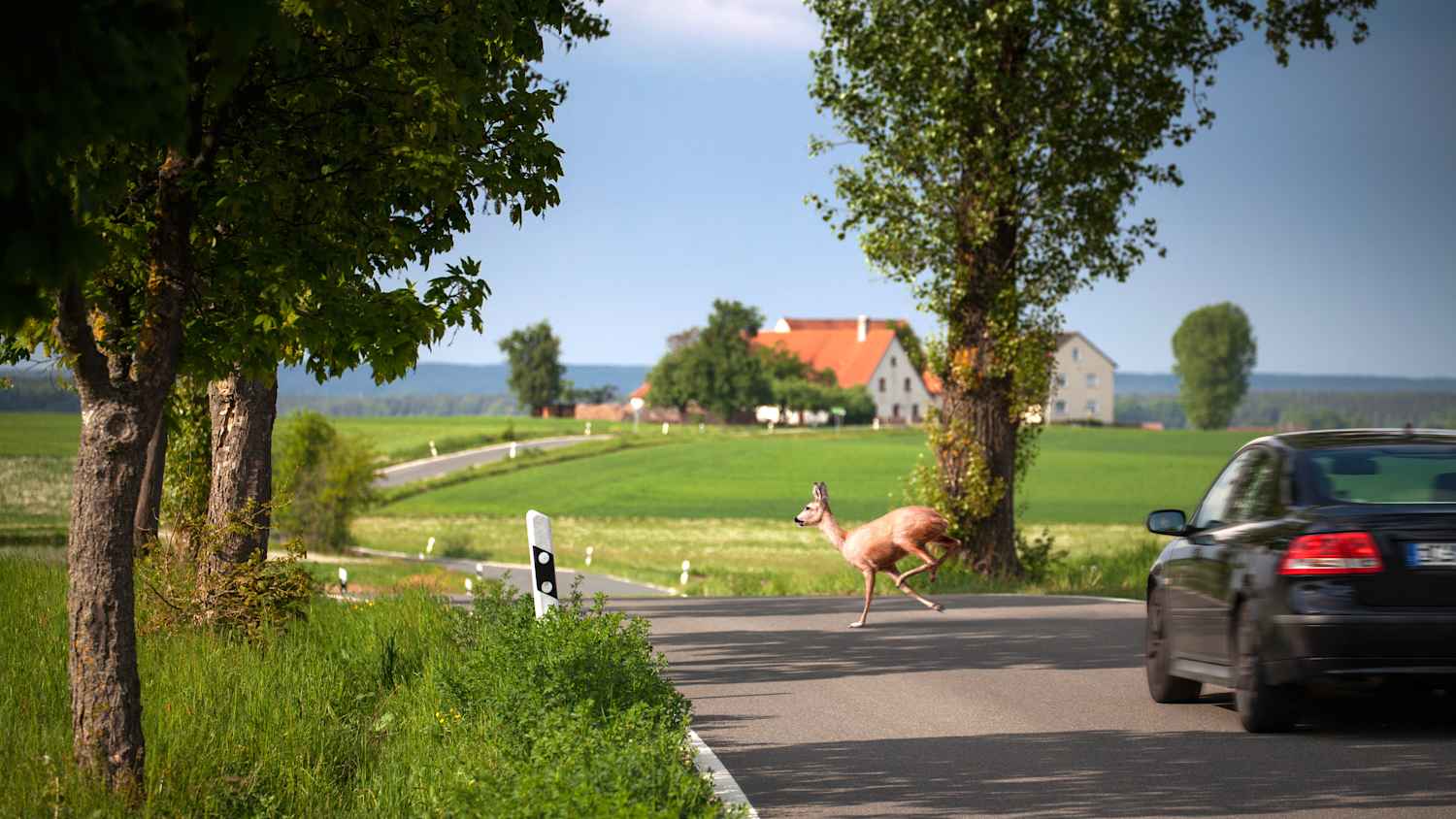 Steht ein Tier direkt auf der Straße: Fernlicht ausschalten und bremsen