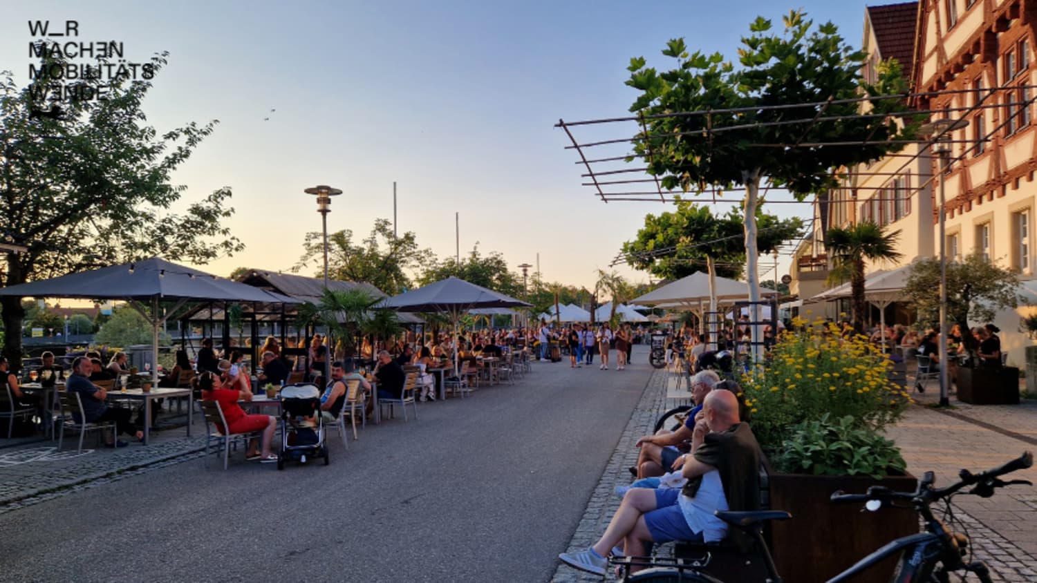Die Stadt sperrte die Alleenstraße in Nürtingen temporär. Rund 15.000 Fahrzeuge nutzten diese viel befahrene Durchgangsstraße bis dahin täglich. Wo bisher vor allem Autos fuhren, ist ein neuer Aufenthaltsraum für die Einwohnerinnen und Einwohner und ihre Besucherinnen und Besucher direkt am Neckar entstanden. Der Stadtbalkon bietet Platz für entspanntes Flanieren, kulinarischen Genuss und erholsame Momente. Die Menschen haben den Stadtbalkon begeistert aufgenommen. Daher setzte die Stadtverwaltung das Projekt im Sommer 2022 erneut um und etablierte es schließlich im Dezember 2022 dauerhaft. Mehr Infos zum Projekt