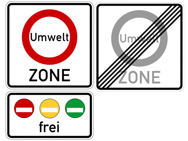 Der Beginn von Fahrverbotszonen wird durch das Zeichen 270.1, das Ende durch Zeichen 270.2 gekennzeichnet (siehe Abbildung). Auf Zusatzzeichen werden jene farbigen Plaketten dargestellt, deren Schadstoffgruppen vom Fahrverbot ausgenommen sind. Denn jede Stadt kann individuell festlegen, in welche Zonen Fahrzeuge mit welcher Plakette einfahren dürfen.