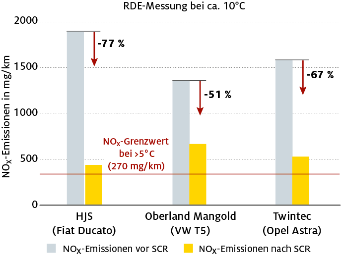 Die gemessenen Reduktionsraten liegen im RDE-Test zwischen 64 und 80 Prozent und drücken den NOₓ-Ausstoß der getesteten Fahrzeuge auf oder unter den Grenzwert von 270 mg/km. Das ist der Wert, der laut Nachrüstrichtlinie im Temperaturbereich von 5 °C bis 30 °C unterschritten werden muss.