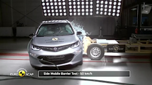 Der Opel Ampera-e erreicht 4 Sterne. Das Fahrzeug ist mit Gurtkraftbegrenzern, Gurtstraffern und seitlichen Kopfairbags in der ersten und zweiten Sitzreihe ausgestattet. Für die vorderen Plätze sind zusätzlich Seitenairbags und optischen und akustischen Gurtwarnern verbaut. Im Insassenschutz zeigen die Rückhaltesysteme in der ersten und zweiten Sitzreihe eine gute Wirkung für Erwachsene, das Verletzungsrisiko ist gering bis sehr gering. Einzig beim Heckcrash ist die Nackenbelastung im mittleren Bereich. Für Kinder ist das Verletzungsrisiko gering bzw. sehr gering. Es sind ISOFIX-Halter an den äußeren hinteren Sitzplätzen montiert, allerdings ohne i-Size-Kennzeichnung. Der mittlere Sitz hinten ist für bestimmte kleine, gegurtete Kindersitze geeignet, die Montage auf dem Beifahrersitz ist unkritisch. Der Frontairbag auf der Beifahrerseite ist deaktivierbar. Der Ampera-e ist mit einem Assistenzpaket mit Notbremsassistent serienmäßig ausgestattet, der gute Ergebnisse liefert.
