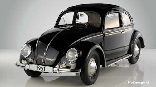 Der VW Käfer geht auf einen Entwurf von Ferdinand Porsche zurück und sollte eigentlich vor dem zweiten Weltkrieg als KdF-Wagen („Kraft durch Freude“) das deutsche Volk mobilisieren. Richtig angelaufen ist die Produktion aber erst 1945, zunächst als Volkswagen, dann als VW Typ 1. Die englische Bezeichnung Beetle („Käfer“) bürgerte sich in den USA schon Anfang der 1950er Jahre ein, in Deutschland setzte sich der Name Käfer erst in den 60ern durch. 1974 wurde die Produktion in Wolfsburg nach fast 12 Millionen Einheiten zu Gunsten des Golf I eingestellt. In Mexiko lief der Käfer dagegen noch bis 2003 vom Band.