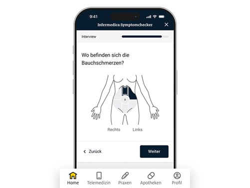 Beginnen Sie damit, Ihre Symptome hinzuzufügen und beantworten Sie einige kurze Fragen. Sie erhalten dann Informationen zu möglichen Ursachen und empfohlenen Schritten. Am Ende des Interviews erhalten Sie eine Liste möglicher Erkrankungen mit Erklärungen und den Grad der empfohlenen Behandlung. Infermedica bietet 5 Triage-Stufen: Selbstbehandlung, Konsultation eines Arztes, Konsultation eines Arztes binnen 24 Stunden, Aufsuchen einer Notaufnahme und Rettungswagen.