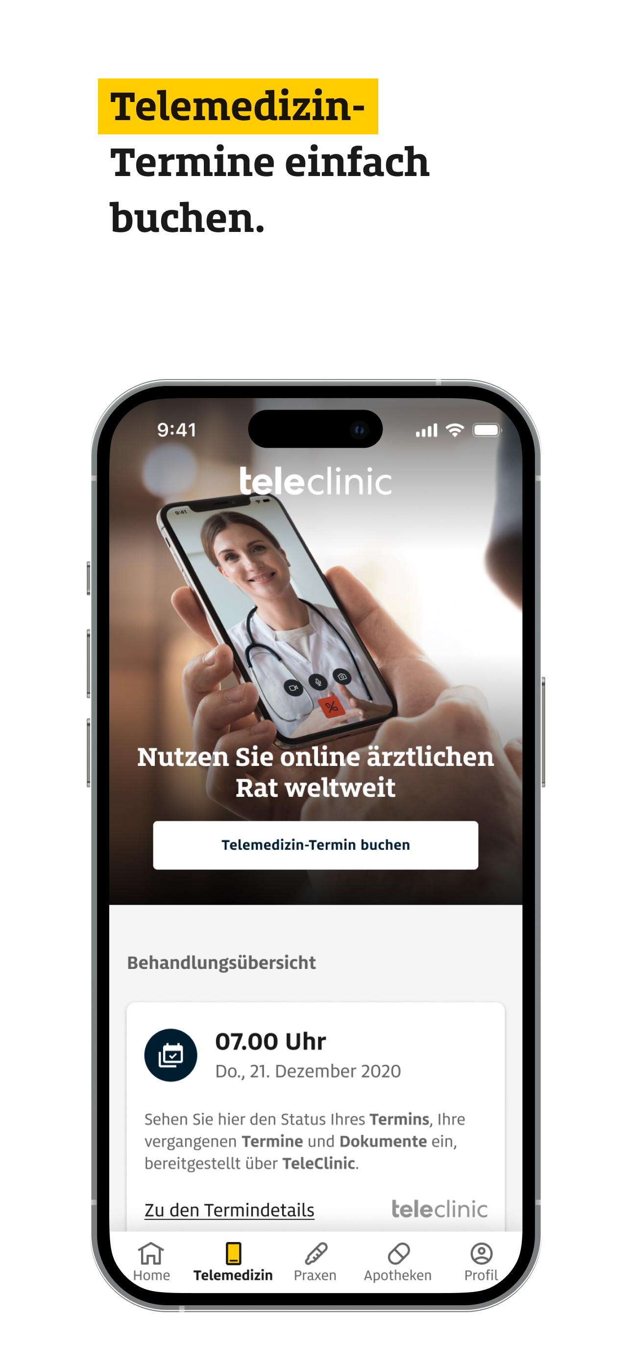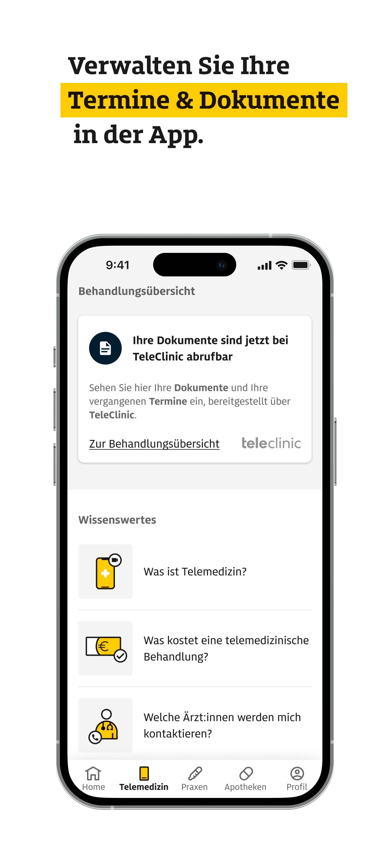 Für den Zugang zu Telemedizin über die Medical App stehen Ihnen die Services von TeleClinic zur Verfügung. Die Kosten für die telemedizinische Behandlung werden von Ihrer Krankenkasse übernommen. Bitte beachten Sie, dass für die Nutzung des Services von TeleClinic eine aktive gesetzliche oder private Krankenversicherung in Deutschland nötig ist.