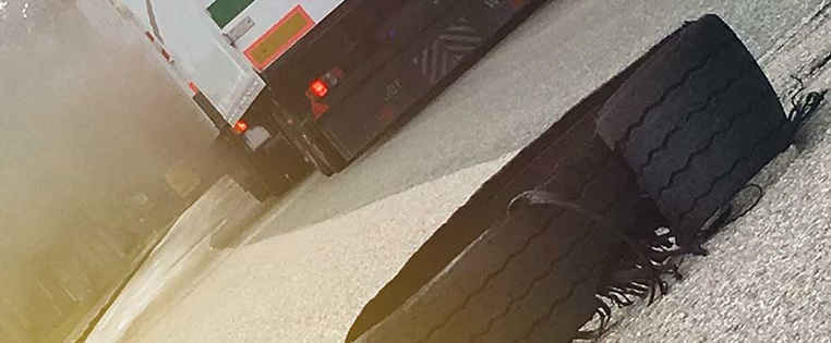 Kommt es dennoch zu einem Reifenplatzer, ist das nicht zu überhören. Ein lauter, explosionsartiger Knall, peitschenartig herumschleudernde Teile und reichlich Rauchentwicklung sind typisch. Der Fahrer sollte keinesfalls vollbremsen, sondern dosiert zwischenbremsen und den Lkw ausrollen lassen.